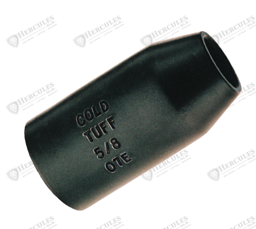 For flemish eye wire rope splicing. Designed for low temperature toughness. Resists cracking when swaged (equals or exceeds stainless steel sleeves). Special processed low carbon steel. COLD TUFF for better swageability. Can be stamped for identification after swaging without concern for fractures when following these directions: Use round corner stamps to a maximum depth of 0.015 in. (1/64). The area for stamping should be on the side of the sleeve in the plane of the sling eye, and no less than 0.250 in. (1/4) from either end of the sleeve. Standard steel sleeve terminations have efficiency ratings as follows based on the catalog strength of wire rope. Do not use on wire rope size other than size shown.